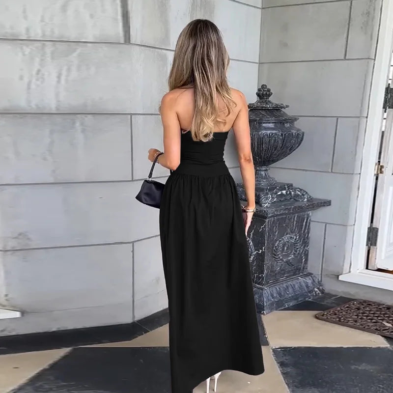 This strapless floor-length maxi dress is the definition of elegance and confidence. Crafted from a high-stretch polyester-spandex blend, it hugs your curves with a flattering slim-fit sheath silhouette and structured empire waistline.