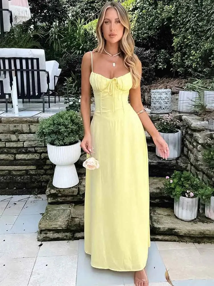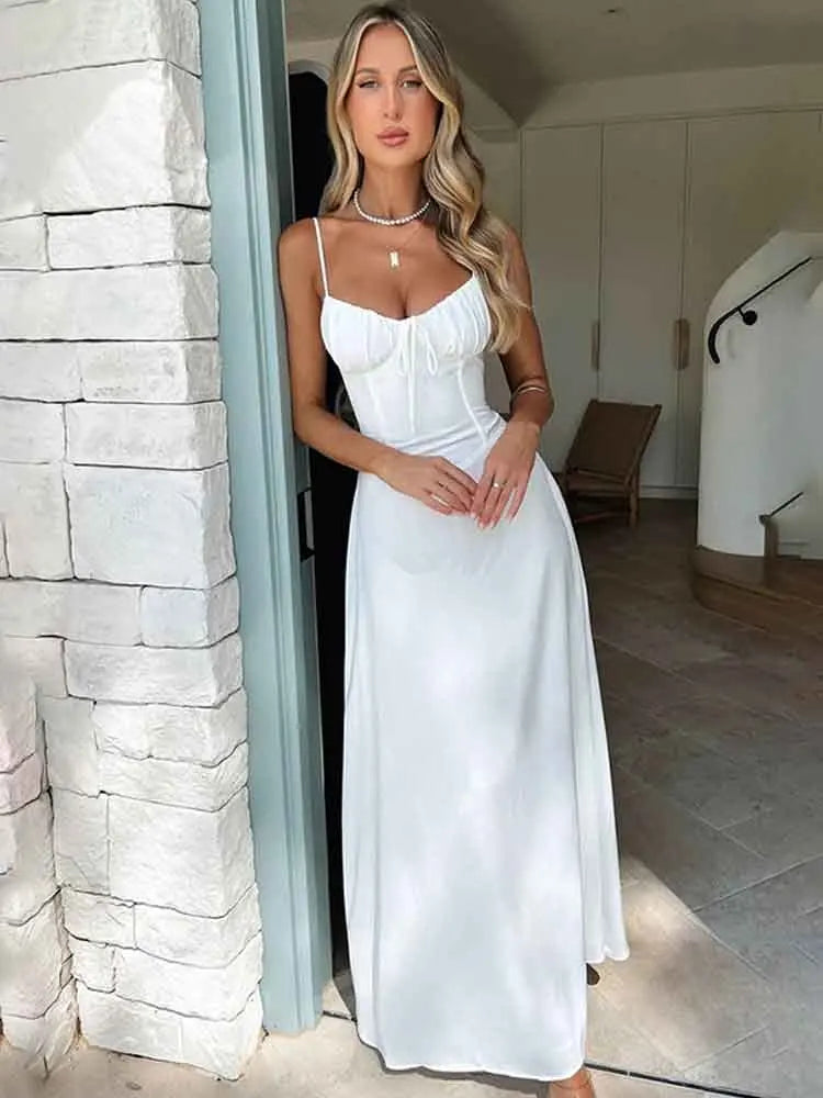 Discover effortless elegance with our Pleated Spaghetti Strap Maxi Dress. Featuring a V-neckline, sleek sheath silhouette, and chic fold details, this summer-ready dress is perfect for club nights, beach parties, or romantic evenings.