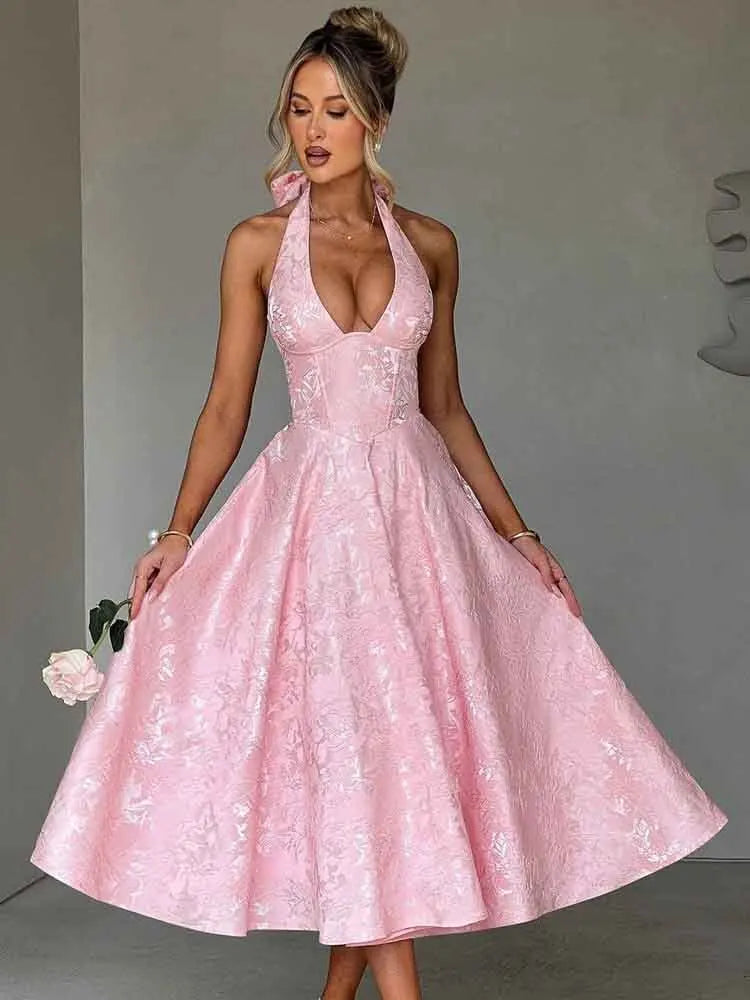 Turn heads with this stunning floor-length jacquard evening dress. Designed with a sleek halter neckline, backless silhouette, and empire waist, it flatters every curve. Made from high-stretch polyester and spandex, it offers comfort, flexibility, and elegant style—perfect for summer weddings, parties, and formal events.
