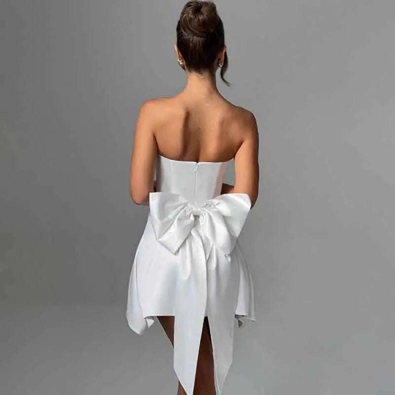 Make an entrance in this satin strapless mini dress — featuring a bold backless bow design, sleek slash neckline, and sexy yet sophisticated silhouette. Crafted from a soft, stretchy polyester-spandex blend, this mini hugs your body in all the right places.