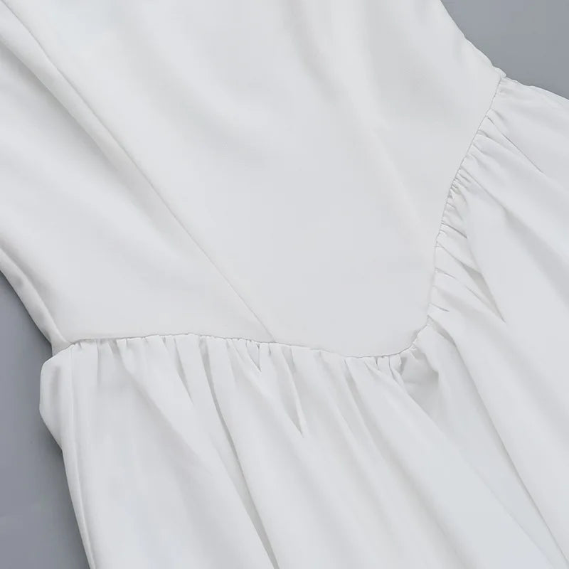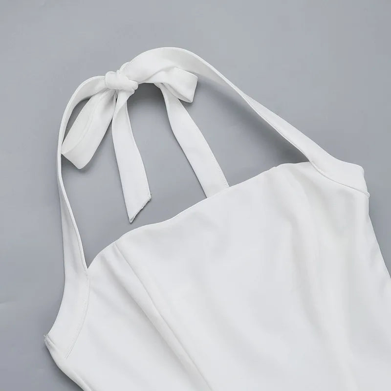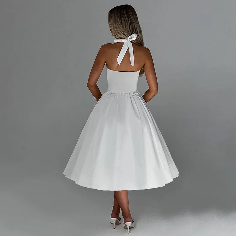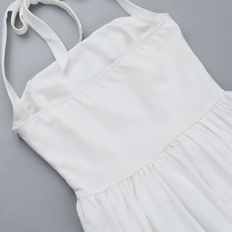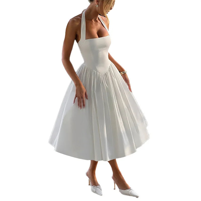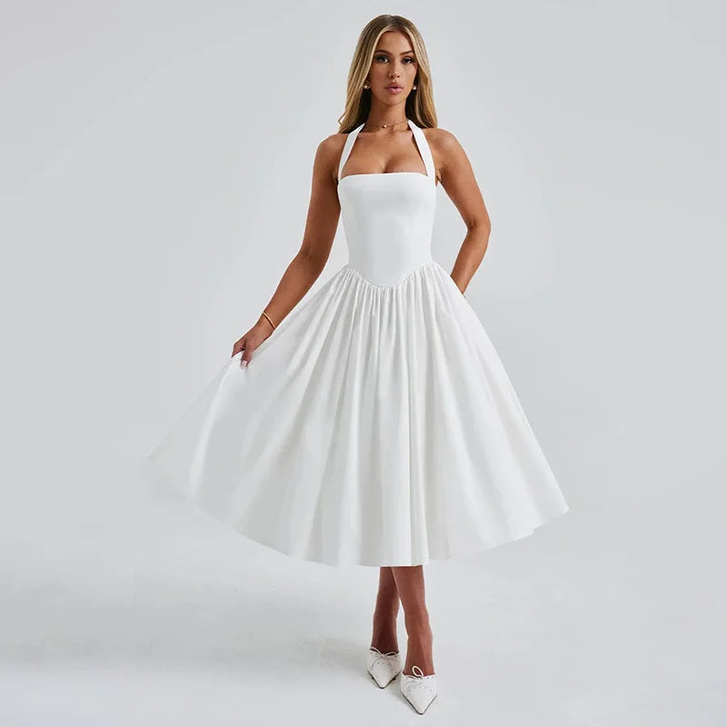 This elegant white halter midi dress is crafted from a soft, high-stretch polyester-spandex blend, offering a flattering fit with an empire waistline and sleeveless halter neckline. The A-line silhouette and pleated skirt create a timeless look that flatters every shape.