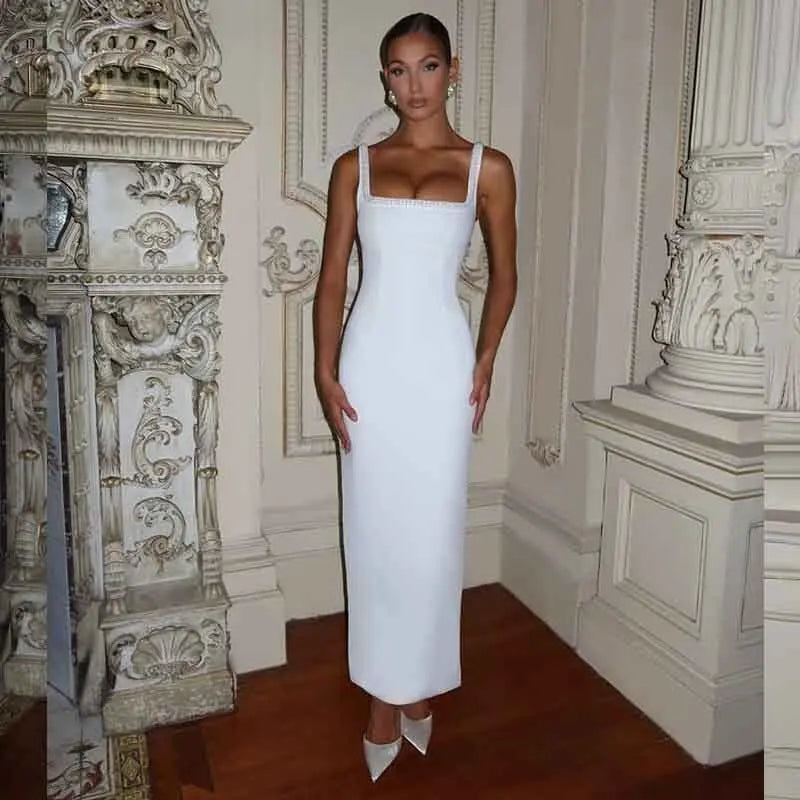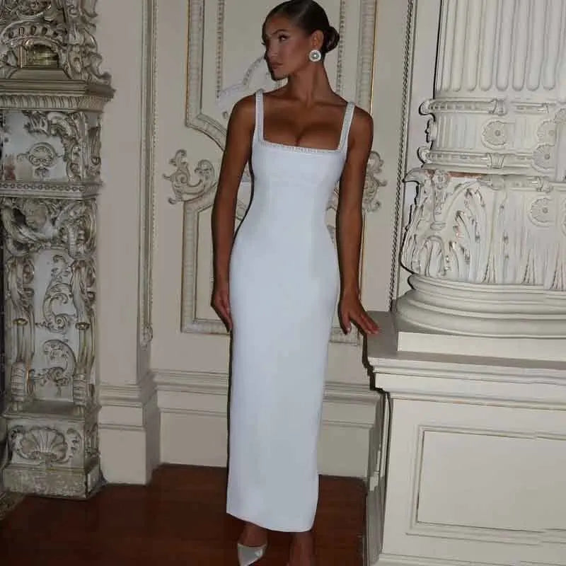 Turn heads in this elegant white pearl backless bow dress, perfect for summer soirées or glamorous evening events. Featuring a flattering slash neck, beaded details, and a sleek sheath silhouette, this ankle-length design offers a chic blend of elegance and sensuality. Crafted from a high-stretch polyester-spandex blend, it ensures comfort and a flattering fit. With its delicate spaghetti straps and slim empire waistline, this dress is ideal for weddings, club nights, or any special occasion. A must-have statement piece for your Summer 2025 wardrobe.